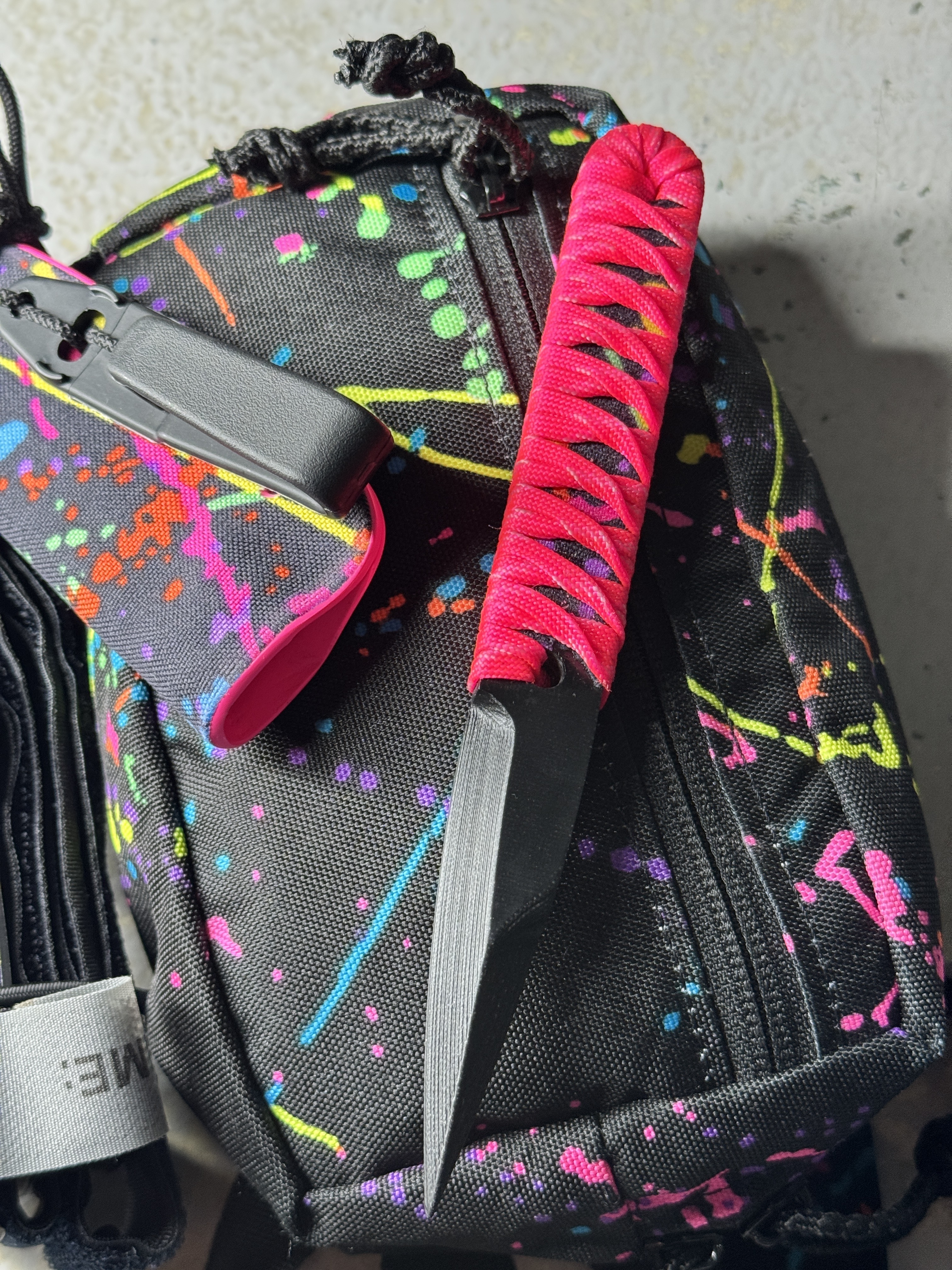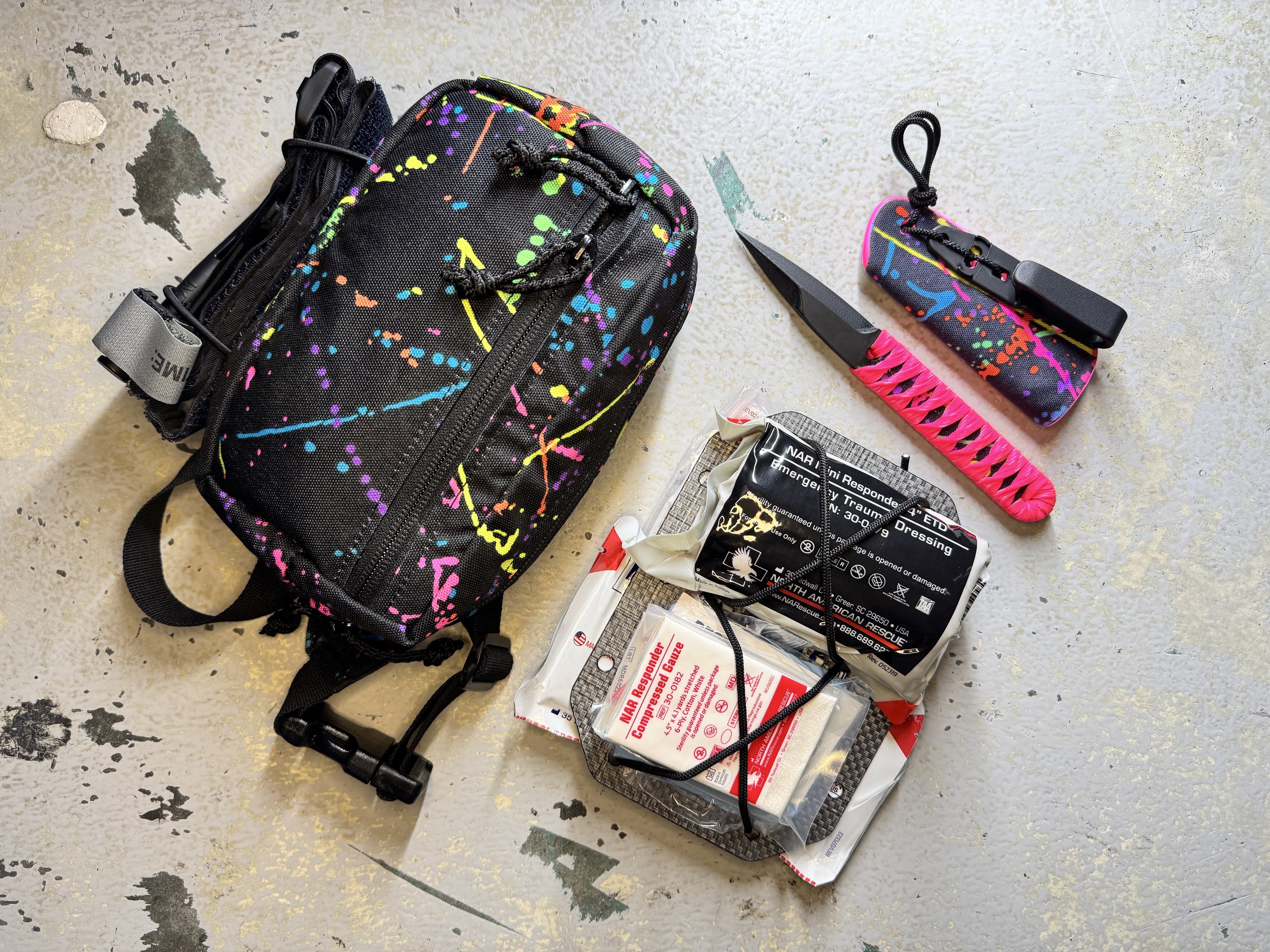 We are giving away a Black Triangle XM-12 with neon splatter underlay and pink paracord-wrapped handle, sheathed in pink kydex and wrapped in neon splatter cordura. In addition to this 1 of 1 knife, we are including a Spiritus Systems OG Neon Splatter Fanny Sack packed with a North American Rescue IFAK attached to a Black Triangle Micro Tegris Panel. Total value on this package is $325 and you could win it.